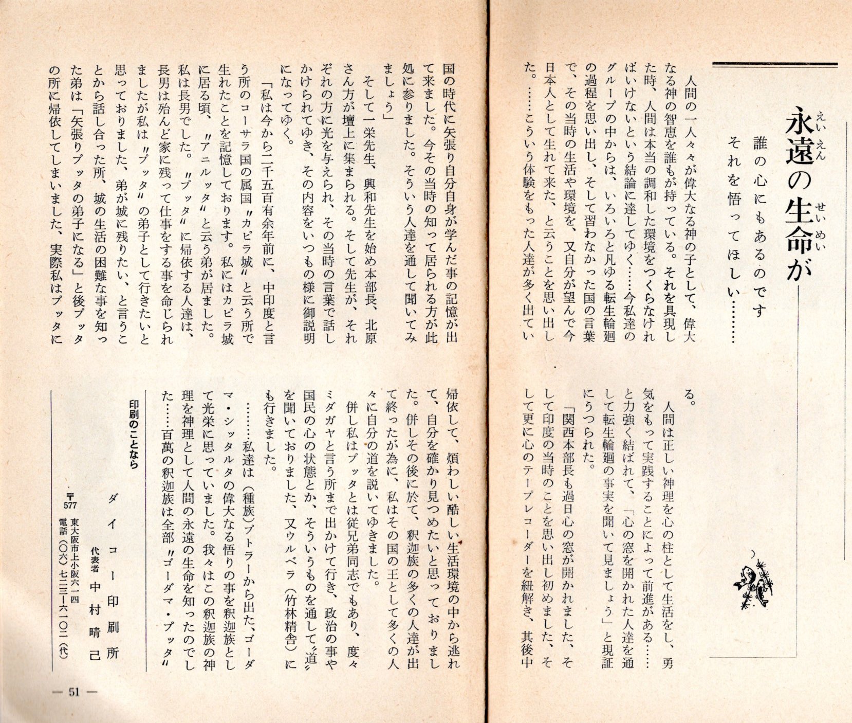 ・・・・・私達はプトラー(種族)から出た、ゴータマ・シッタルタの偉大なる悟りの事を釈迦族として光栄に思っていました。我々はこの釈迦族の神理を神理として人間の永遠の生命を知ったのでした・・・・・百萬の釈迦族は全部“ゴーダマ・ブッタ”に帰依したものです・・・・・」 関西本部長(マーハー・ナマ)