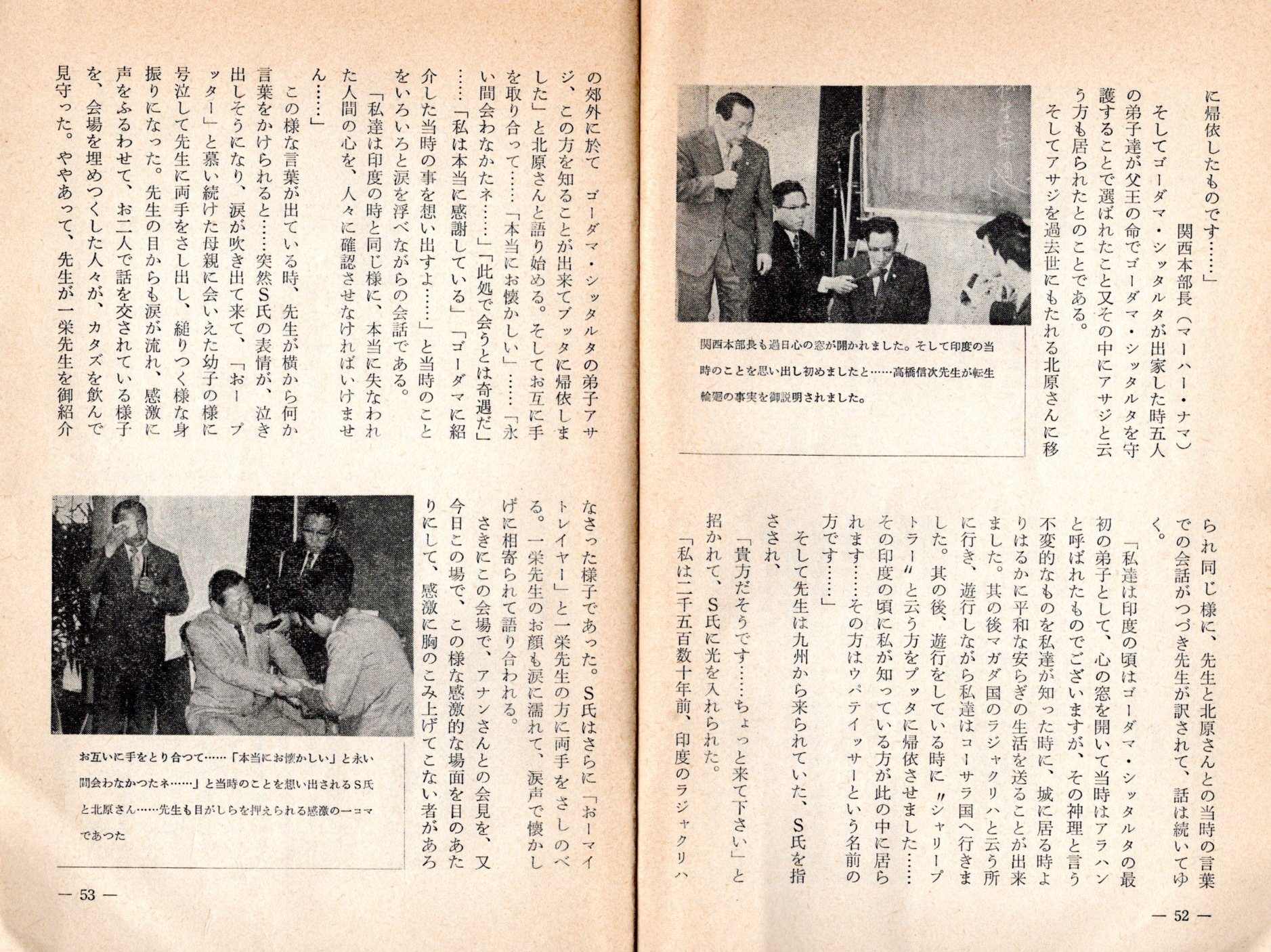 この様な言葉が出ている時、先生が横から何か言葉をかけられると・・・・・突然S氏の表情が、泣き出しそうになり、涙が吹き出て来て、「おーブッター」と慕い続けた母親に会えた幼子の様に号泣して先生に両手をさし出し、縋りつく様な身振りになった。先生の目からも涙が流れ、感激に声をふるわせて、お二人で話を交わされている様子を、会場を埋めつくした人々が、カタズを飲んで見守った。ややあって、先生が一栄先生を御紹介なさった様子であった。