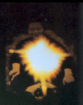 そして又、天上の世界の、今度は、心の調和されているエルランティという方になりますと、ここにパワートロンというものを持っています。(以下図を書きながら説明)頭にちゃんとパワートロンというのをつけています。パワートロンといいます。神の光をストレートで受けている光ですね。このパワートロンから、光がピューッとこうやって出ているわけです。ですから見ておりますと、頭からも、身体からも光が出てきておりますから、光の化身だと思えばいいですね。そうして、このパワートロンと、その人の、エル・ランティの心のところと、全く同じ位置、だいたい八十センチから七十センチのところに玉があります。このようになっております。これがドームです。そして、このドームからも光が出ています。やわらかい金色の光です。こういう光が出ております。大きな光ですね。そして、このパワートロンの光が、このように発射していると同時に、ここに今度は魂の分霊ですね。光の分霊である、イエス 様、モーゼ様、カンターレ、この意識がはいっております。これから七十センチ位ですね。この頭の上から、そして例えば、私が、イエス様の当時の話をしますと、例えば、これがイエス様だとすると、今度、これがクルクルッと廻りまして、こちらの人の、私の身体の中にはいってくるから、今度、イエス様の顔になっちゃうわけですね。お釈迦様のこんど、話をしますと、こちらが出て、今度、お釈迦様の意識がはいって、その当時の意識が身体の中にはいってくるから、今度、お釈迦様の顔になっちゃうわけです。ですから、普通、私が講演を全国して歩いとって〃あの方は、お釈迦様の生まれ変わりだ〃という人が出てくるわけですね。見えちゃうから。インドの時、耳たぼなんかこんなに小さいのに、こうなってくるわけですね。眼の方が、ずーっと、こうやって細くなってきちゃう。見とって、皆んなビックリしてしまうわけです。そうすると、その人達にとって、お釈迦様に見えちゃうわけです。これは光の分霊っていうわけです。エル・ランティの光の分霊、この光の分霊というのが、個性を持っておりますから、そうやって出て来ますね。ところがいつのまにか、お釈迦様や、モーゼや、イエス様や、或いは又、もっと下の方の段階におるところの回教、こういうのをメシヤというわけですね。このメシヤを拝むようになっちゃった。メシヤ信仰になってしまった。これは大きな間違いですね。メシヤの説くのは神の心である法を説きに来ているのです。人間はこのようにしなければいけないんだ。メシヤ信仰ではなく、メシヤを信じることです。メシヤの言葉を信ずることです。そうして、その言葉が法なのです。その法を行ずることです。これが本当の信仰なのですね。ですから本来はメシヤ信仰であってはならない。仏教では、お釈迦様は絶対ですね。だからいつのまにか〃オシャカ〃なんて言葉が出来ちゃうわけです。それは困りますね。お釈迦様の説かれた法、その法を生活の中に生かすことです。そうして、自分自身が、説かれた、その悟られたメシヤのような豊かな心になるということ。イエス・キリストを拝んじまって、何んでもイエス様、イエス様。迷惑ですね。イエス様は一人しかいないんだから世界中の人が、イエス様を呼んだらどういうことになるでしょう。そこでエル・ランティーであるところのヤハベー(ヤーベー)は「汝ら、みだりにヤハベーの名前を呼ぶことなかれ。」といっていますね。それなんです。一人なんですから、呼ばれたって仕様がないんです。皆さんだってそうでしょう。仕事をしておって、仕事の途中で何回も呼ばれると、「うるせえなあ」ということになりますね。これは同じです。我々は、ややもすると、次元の違う世界を呼べば、何んでもやってくれると思っているがとんでもない事です。一番大事なことは、メシヤの説く、法というものを実行するということ、これが大事です。そして、このエル・ランティは、光そのものです。天上の世界へ行くと光そのものです。光の化身です。といって、神ではありません。神は、又、こちらにあるわけです。いまだかつて地球上に神だなんて言って出て来た人は百%嘘です。どんなものだって、神様になんかにはなれないんです。神は一つです。宇宙には神は一つです。こういう、エル・ランティと同じような人達が、宇宙に、真のメシヤという人達がおります。